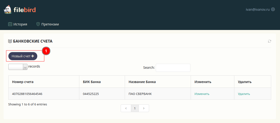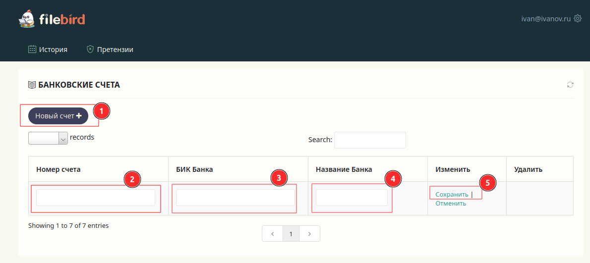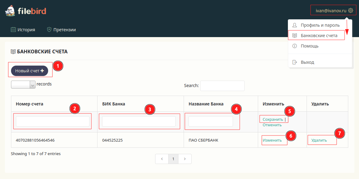 На этой же странице вы можете изменить (6) реквизиты или удалить (7) ненужные банковские счета.