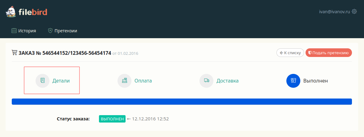 Оформление заказа: после успешного размещения заказа на платформе FileBird