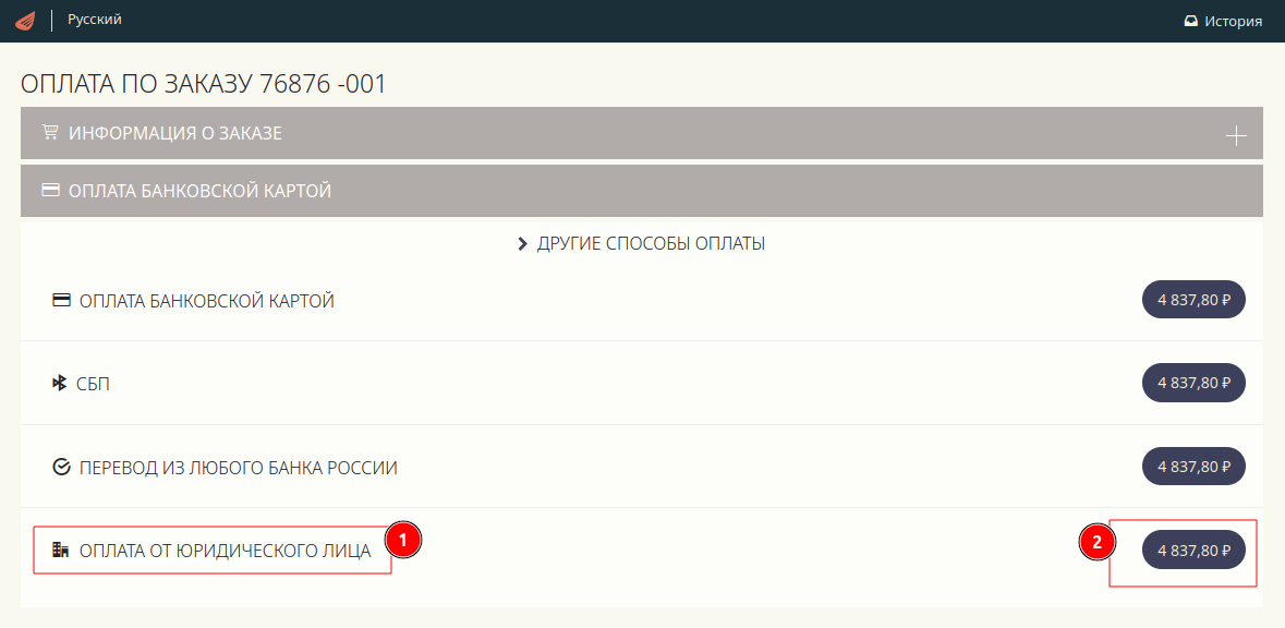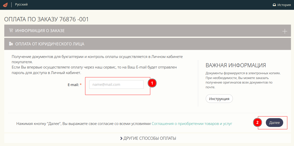 Пошаговая инструкция по оплате заказа от имени юридического лица