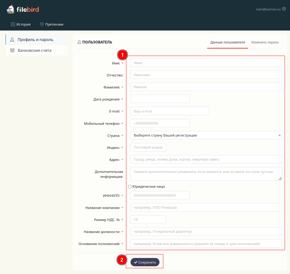 Заполнение анкеты: при первом входе откроется страница "Анкету пользователя FileBird". Внесите данные о директоре и реквизитах вашей организации. По завершении заполнения сохраните введенную информацию.