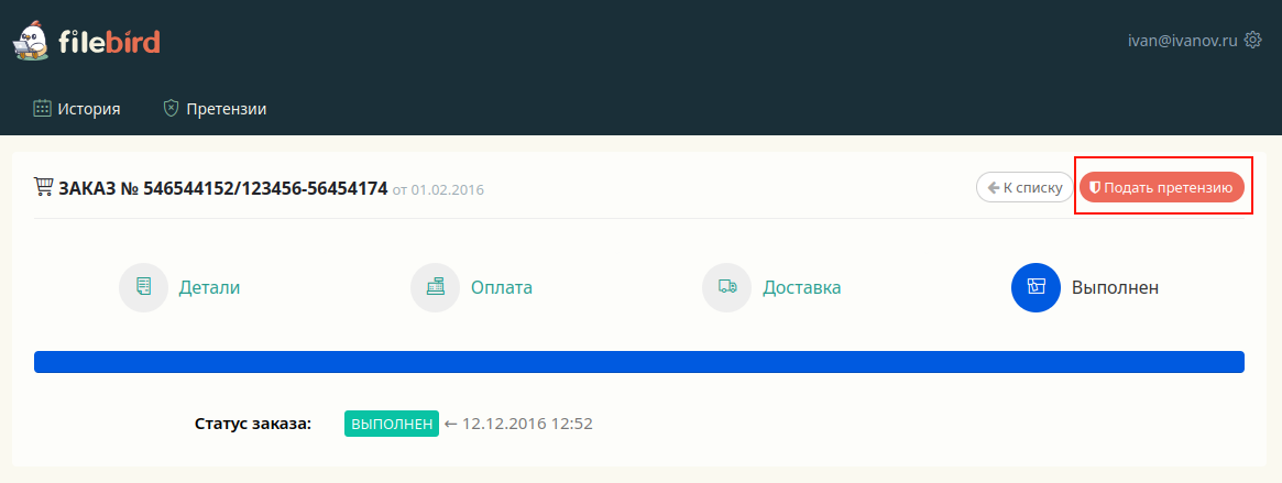 - Для подачи претензии нажмите на кнопку "Подать претензию", в правом верхнем углу страницы.