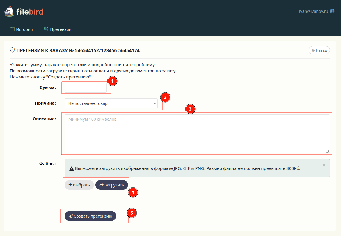 - Заполните форму претензии. Приложите все возможные доказательства вины поставщика. По завершении нажмите кнопку "Создать претензию".