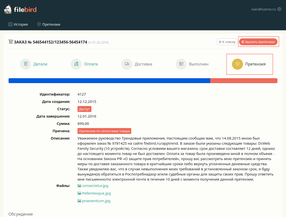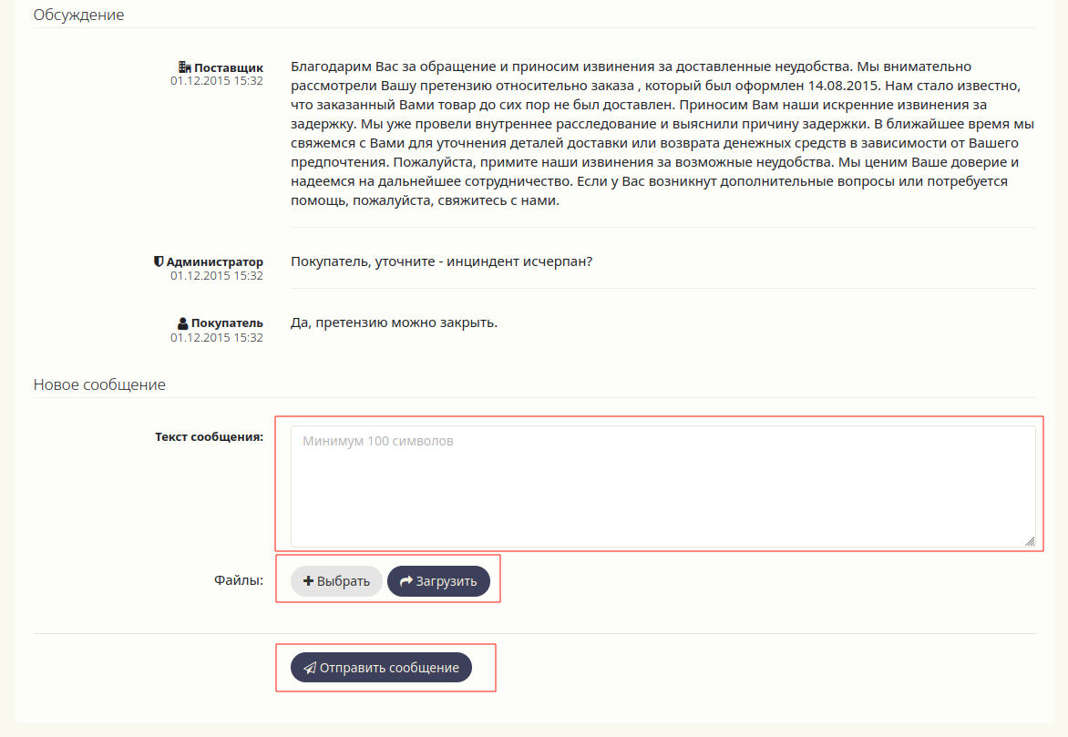 - На этой же странице будет обсуждение претензии с поставщиком. Можно добавлять