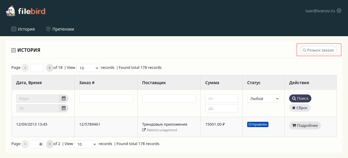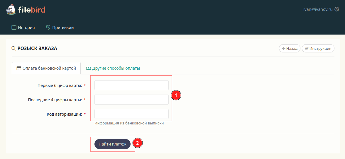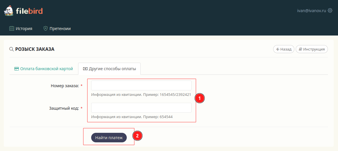 Большинство покупок в Filebird совершаются без регистрации, однако в отдельных случаях могут потребоваться данные платежа, например, для его блокировки, отслеживания истории покупок или подачи претензии поставщику. Поиск платежа производится на основе информации, содержащейся в комментарии к платежу, будь то оплата через платежную систему, банковский перевод или оплата через терминал, либо информация, полученная из банковской выписки, если оплата производилась банковской картой.