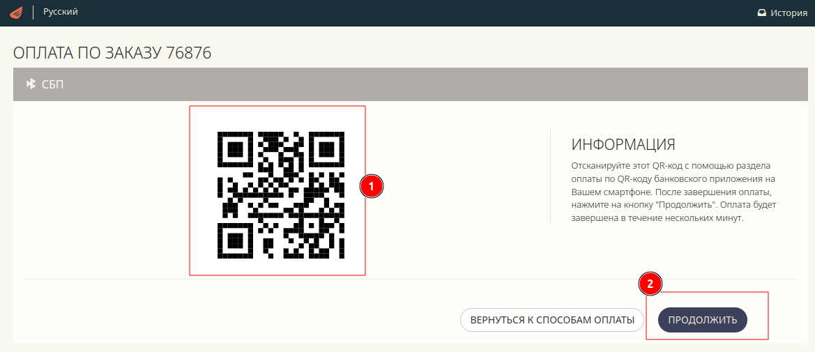 Если страница оплаты открыта на мобильном устройстве, то вместо QR-код откроется страница для выбора банка.