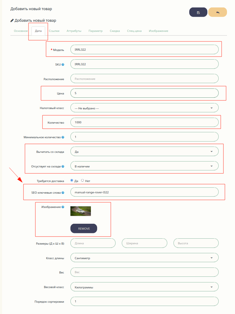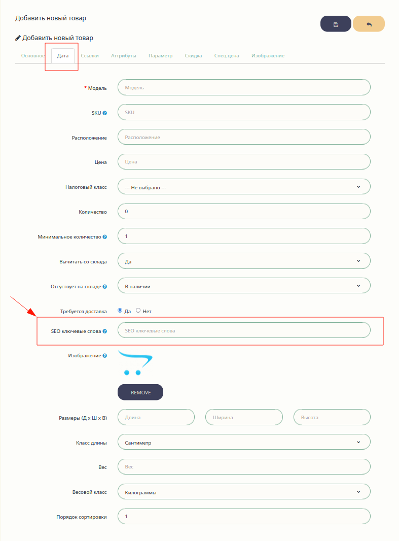 Переход на вкладку "Дата": Теперь перейди на вкладку "Дата" (она ещё называется "Характеристики"). Здесь есть важное поле — "SEO-ключевые слова". Пожалуйста, не используй пробелы, специальные символы и другие языки, кроме английского. Если тебе нужно перевести название товара на английский, можешь воспользоваться онлайн-сервисами вроде Transliteration.PRO. В остальном, гла��ное заполнить обязательные поля.