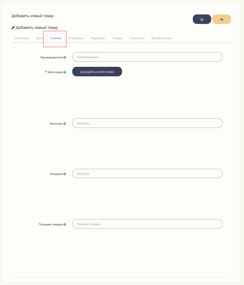 Указываем производителя и категорию: Перейди на вкладку "Ссылки". Там выбери производителя товара и категорию, куда он относится.